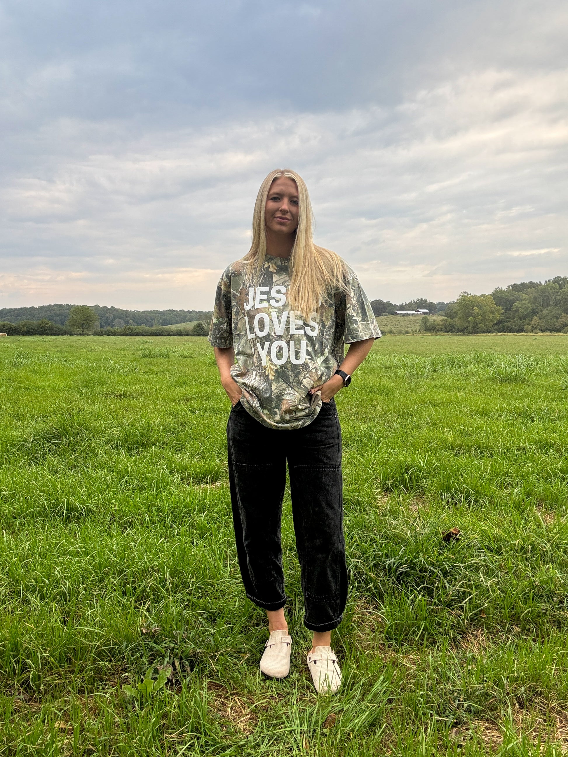 Make a bold statement with the JESUS LOVES YOU Camo Tee, blending timeless faith with modern style. Crafted from comfortable, durable fabric, this tee features a distinctive camo pattern paired with a powerful message, perfect for expressing your beliefs wherever you go. Ideal for casual wear, it offers a confident look with meaningful impact.