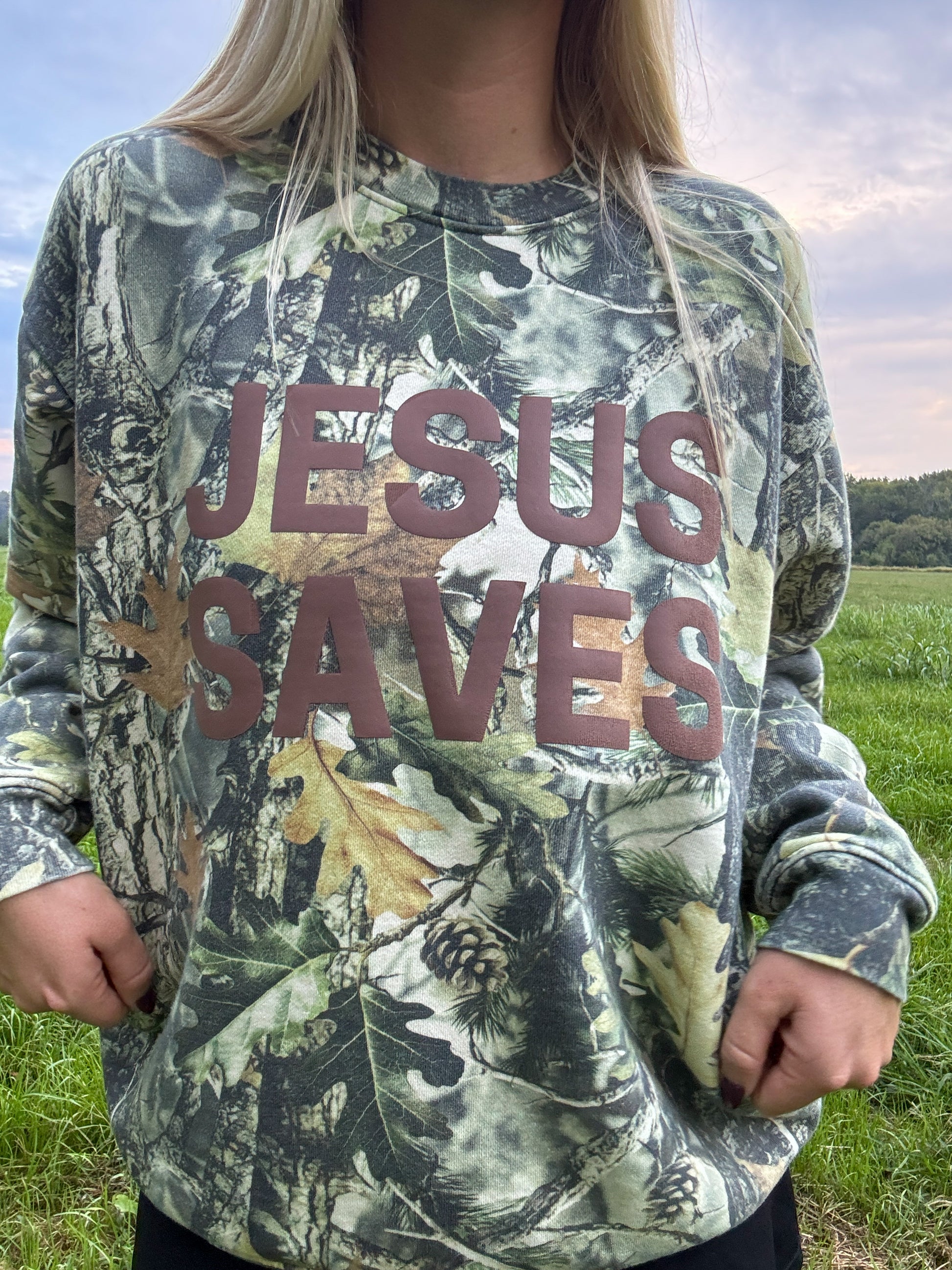 JESUS SAVES Camo Crewneck